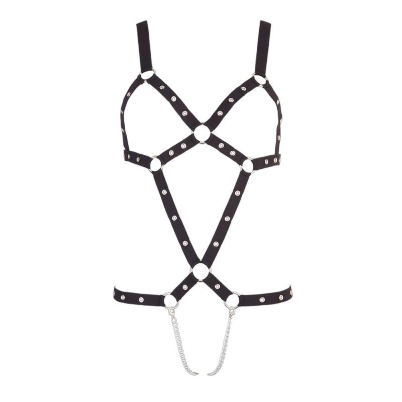 Con questo corpo strap nero composto da cinghie web tempestate di borchie, i giochi bondage pihot sono pre-programmati! Particolarmente formicolanti sono le 2 catene metalliche staccabili che attraversano l'inguine....