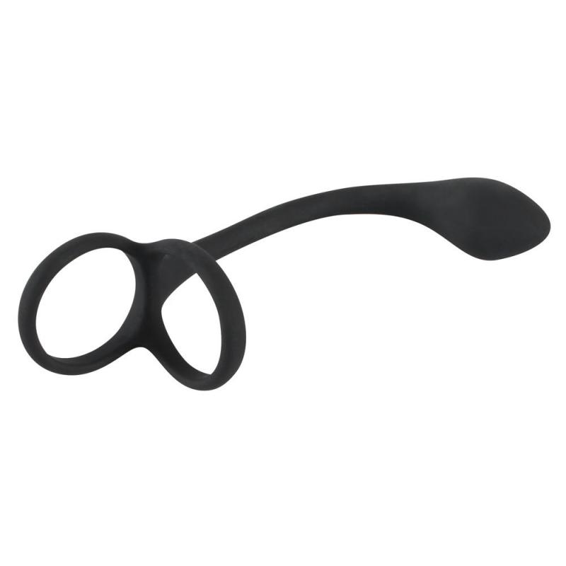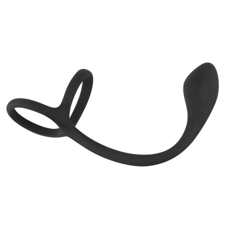 Cock & ball ring con butt plug di Black Velvets un anello combinato pene/testicolo con un plug anale saldamente bloccato. Gli anelli integrati vengono tirati sul pene e sui testicoli e forniscono un effetto di stasi del sangue che rende l'erezione ancora pidura, piforte e, soprattutto, piduratura. Il plug anale stesso ha una testa ispessita per una stimolazione mirata della prostata, il punto di piacere dell'uomo conosciuto come punto P. L'asta stretta del plug anale scorre dolcemente nella barra di collegamento all'anello del pene e all'anello del testicolo e serve anche a stimolare il perineo. Realizzato in materiale siliconico skin-friendly con una consistenza morbida al tatto, il cock & ball ring con butt plug puanche essere indossato permanentemente durante il sesso o discretamente sotto i vestiti.