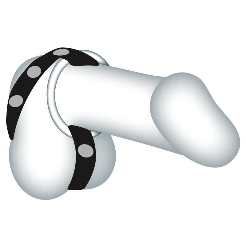 Cinghia di pelle regolabile con borchie decorative e tra anelli per pene metallici sostituibili: 3 cm, 3,5 cm e 4 cm. Nero/argento. Materiale: pelle crosta, metallo.
