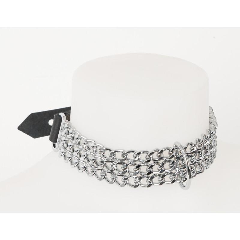 Lezioni di obbedienza desiderate?Polsino da collo in pelle nera con tre catene a maglie metalliche, a cui attaccato un anello di collegamento, che attende la linea guida... Regolabile con chiusura a fibbia. Materiale: pelle crosta, metallo.Destinatario :