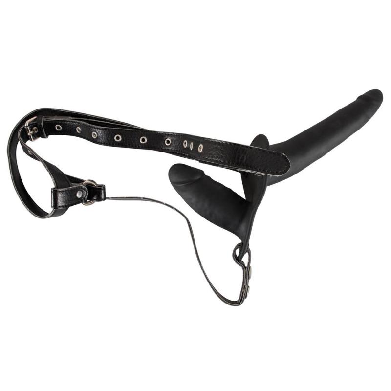Per i giochi di ruolo arrapanti!Stringa strap-on regolabile con due dildo fissi. Nero. Dildo 1: 15 cm di lunghezza, da 2,3 a 3,2 cm. Dildo 2: 8,5 cm di lunghezza, da 2,2 a 3 cm. Materiale: silicone, finta pelle.Destinatario :