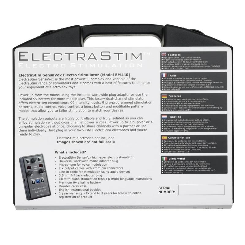 ElectraStim SensaVox is a powerful electro sex stimulator that can be controlled by either mains or battery power. It has a wide range of features to explore and can even stimulate in sympathy with audio using the included microphone or line-in cable.Stimulator FeaturesMains or battery powered2 truly isolated stimulation channels (use different intensity levels on each channel)9 pattern setti ...Destinatario :