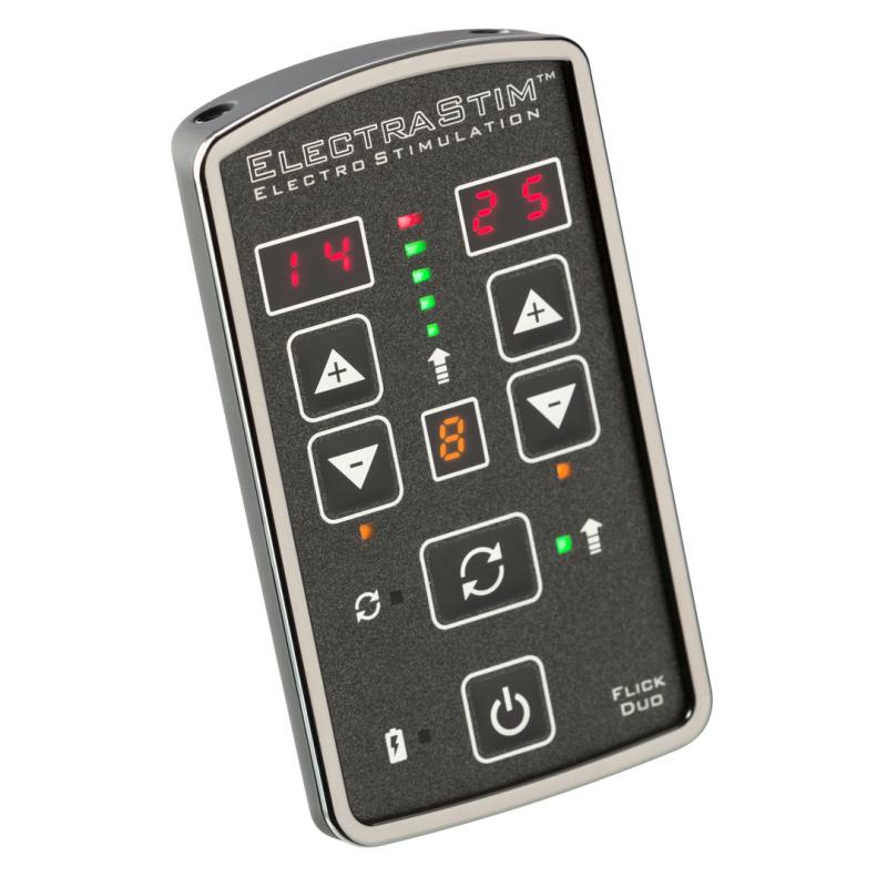 The ElectraStim Flick EM80-E pack includes a Flick Duo dual-channel stimulator, all required cables and a set of 4 ElectraPads, so you have everything you need to start experimenting with electro sex. Perfect for beginners or those upgrading an old e-stim stimulator, Flick has a host of features to explore. A luxurious slim-line stimulator with LED display and ergonomic control.Try the 4 Flick modes for stimulation that flows in sympathy with a ?flicking? wrist action for truly customisable patterns.Flick stimulators are perfect for enhancing masturbation, foreplay and sex with the thrilling and unique tingling and pulsating of electrosex.Stimulator Features8 different stimulation patterns4 motion sympathetic Flick setting - stimulate using a flicking motion across one or both channels25 intensity levels2 isolated stimulation channels - Individual intensity control for each channelUSB rechargeable3-year guarantee when you register your purchaseIncludesEM80 stimulator4 Conductive pads2 x connecting wires (2mm pin connection)USB charging cableStorage Pouch