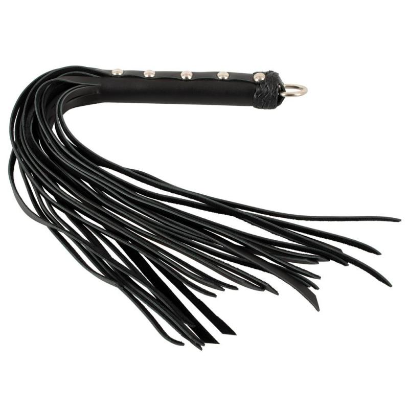 Piccolo e maneggevole flogger principiante in pelle di ZADO con manico rivettato e molte cinghie in pelle morbida. Strumento perfetto per accarezzare e frustare per i principianti del piacere di frustare.