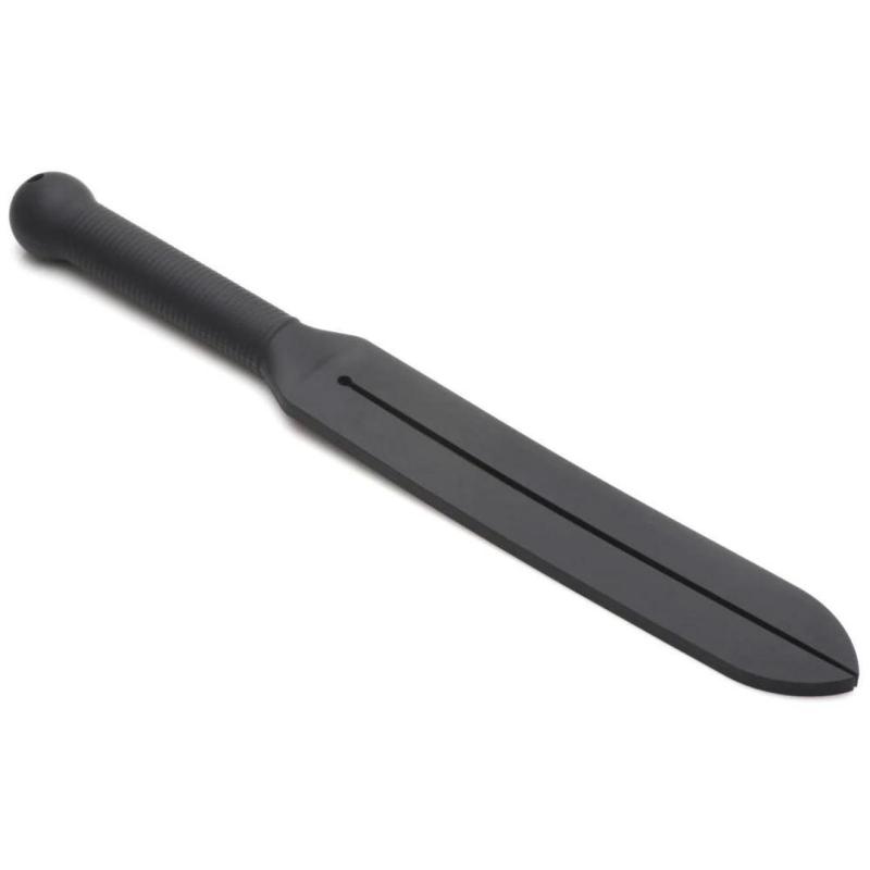 Punish your lover with a Silicone Tawse or split strap that gives them a stinging bite with each blow to their backside! Made out of premium silicone, it is a bit heavier than a lather or faux leather strap and much easier to clean! With this split end strap, you can deliver stingy blows that may leave a mark unless you're careful! The handle itself can also be used as an implement for impact play, as well! The handle has a reinforced metal rod in the center so it's durable and strong beat them with the handle for a bit more thuddy impact! The handle also has subtle rings along it that add a little more grip and texture. They may enjoy the round ball end or the entire length of the shaft-like handle. Made of phthalate-free, plush, silky smooth silicone, it can be exposed to all kinds of bodily fluids and still be cleaned easily. Do not use silicone lube and stick with water-based lubricants only for best results. After play, wash with warm water and mild soap, then spray with a toy cleaner and wipe dry. Warm up your partner with playful slaps, spankings and focused attention. After they've consented to using the tawse, give them a few whacks on their backside across their buttocks or thighs. Slowly warm up to harder or more frequent blows and enjoy touching them and feeling the heat rise where you land the blows. Mix it up and use the handle end on their bottom, back or feet! Want to get devious? Use the handle to penetrate their holes and mix pleasure with pain!Measurements: Overall length: 15 inches. Paddle width: 1.75 inches.Materials: Silicone, metal Color: BlackNote: Do not use with silicone lubricants and store separately from silicone toys.Key Features:Split Ends: The tawse was a popular tool for punishment in Scottish schools and in corporal punishment. By splitting the ends, it adds a little extra bite to it as two separate straps land across your partner's backside.Long Straps: The longer straps allow for long, broad strokes along the bottom, back or thighs. Be careful if they whip around to the front!Grippy, Reinforced Handle: The thick, grippy handle has subtle textured lines that help you hold on even when it's been exposed to lubricants. The round ball at the end has a hole through it so you can thread a rope or string through it to hand it up. Enjoy using this as a heavy impact play tool or even a dildo! It has been reinforced with a metal rod in the handle for extra durability.Premium Silicone: The silicone can be both thuddy (due to the weight) and stingy when made into a strap or tawse. It also allows it to be easily cleaned if you use it in messy play that results in exposure to bodily fluids!