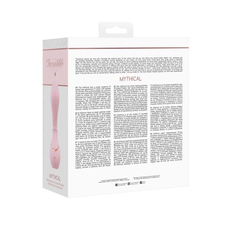 The Mythical has a super powerful 10 speed new generation F1 motor with flexible tip vibrator that accommodates any woman's shape and is perfectly shaped for hitting your g-spot to create the most intense internal and external orgasm ever experienced! The Mythical has a rechargeable battery with a magnetic USB charging port and included charger. When fully charged it will last for 60 min It's soft to the touch, smooth and waterproof design is made from medical grade silicone, making the Mythical easy to clean.Touchless Airwave TechnologyThe Irresistible Collection is not just any collection of sex toys. They are the best sex toys for women in the market period! What makes The Irresistible Collection so special is that our clitoral vibrator is made from high grade silicone and is equipped with our Touchless Air Wave Technology.The Irresistible Collection is the ideal combination of cutting-edge technology, high-quality, aesthetics and ergonomic design. The Technology works by gently and indirectly, stimulating the clitoris with 11 different intensity levels ranging from super-soft to powerful. This beautifully designed toys encircles your clitoris without touching it and stimulates it via soft pressure air waves which creates a unique tissue penetrating vibration that cannot be achieved without the use of this technology. (Sound waves can travel through various media including liquids and solids. The average propagation speed for sound in body tissue is 1540 m/s, the speed of sound also varies by the medium it travels through. Sound waves travels faster through muscle tissues than liquids). With the creation of our Touchless Airwave Technology, we are able to create the perfect sound wave pulsation which can travel through tissue and stimulate the clitoral nerve endings producing the most profound orgasms you will ever experience!Unlike other vibrators which can irritate or desensitize your clitoris by overstimulation. The Irresistible Collection is not subject to overstimulation due to its Touchless Air Wave Technology. Are you ready to experience the most intense orgasms of your life?VibrationThe Invincible (IRR003) and Mythical (IRR004) will make you tremble with pleasure with its worldwide patent pending technology which creates a touch-less sucking sensation on your clitoris via sonic pulse waves and combining it with its super powerful new generation F1 motor with 10 vibration patterns that accommodates any woman's shape to create the most intense orgasm ever experienced!Waterproof Hygienic Sealed MembraneThe Irresistible Collection is 100% waterproof with an IP70 rating which is the highest level possible - this means you can go back to using your shower head for what it was intended for. It also contains a medical grade hygienic sealed membrane to protect you from fluids running down into the toys mechanism.