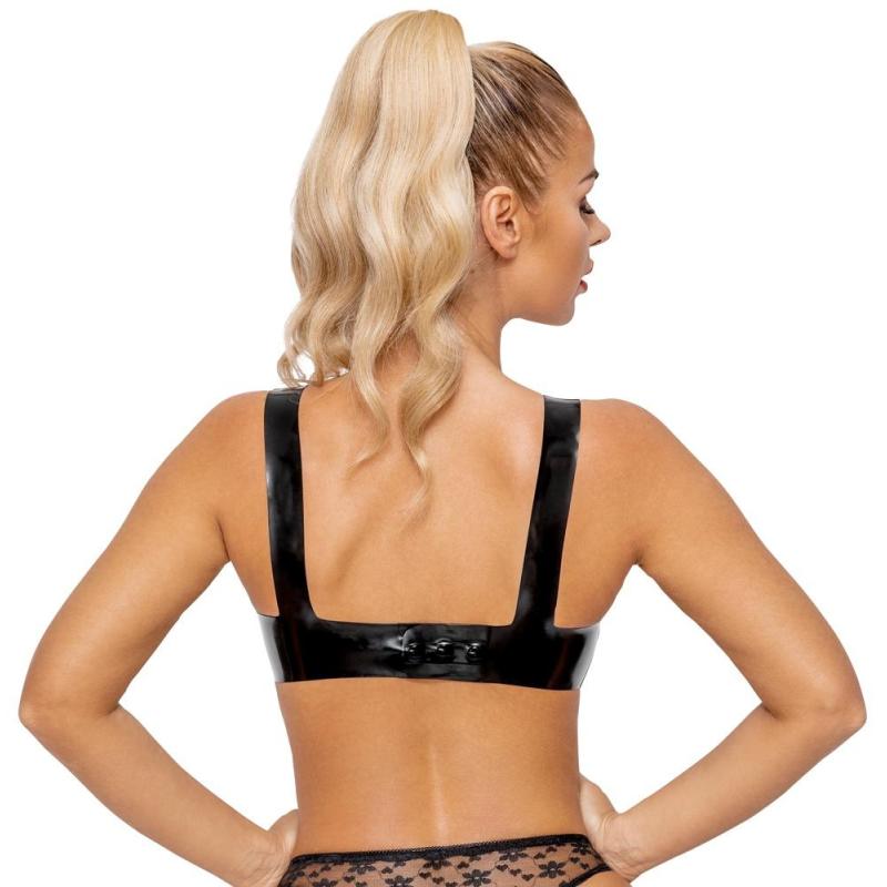 Semplice e bellissimo bustier in lattice naturale nero di LateX con scollatura elegante e chiusura a scatto regolabile sul retro. Puessere combinato in molti modi, come reggiseno sotto gli abiti o come top.