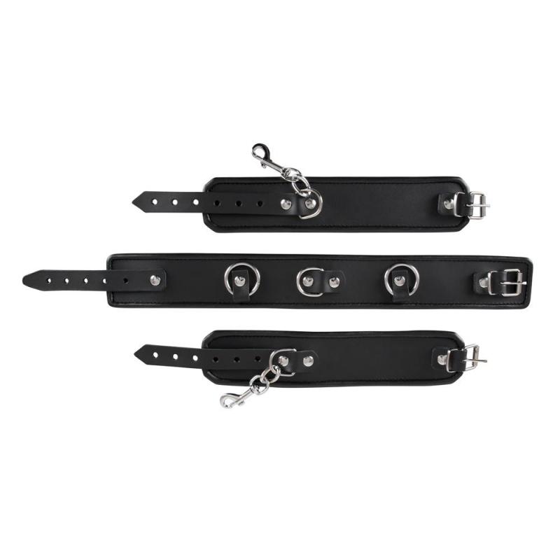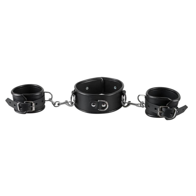 Obbedienza richiesta!Set da bondage composto da due manette e una manetta per il collo. Le manette possono essere fissate al polsino del collo con moschettoni. Questo ha anche anelli sul lato e un anello a D davanti. I bordi dei polsini sono bordati. Nero. Materiale: pelle crosta, metallo (cromato).Destinatario :