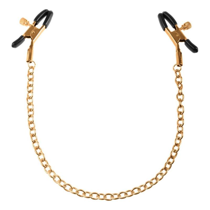 Se feticcio, allora nobile feticcio!Queste pinze per capezzoli sono fatte per giochi fetish particolarmente nobili! Si pu godere il dolce dolore ai capezzoli o solo una leggera pressione, perch le pinze stesse sono facili da regolare. La catena di collegamento d'oro completa il design e invita a giochi emozionanti.Lunghezza totale 42 cm, 29 g. Metallo, PVC.Destinatario :