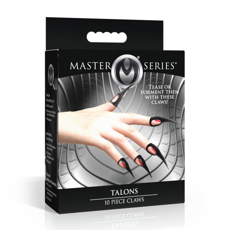 Unleash your inner creature with Talons 10 Piece Claws! Designed to fit every finger, this set of 10 rings in 5 different sizes is perfect for creative and sensory exploration. The tapered, pointed tips are ideal for stimulating touch play, while the flexible design allows you to wear them on bare skin or over gloves. Crafted from phthalate-free plastic, these claws are both safe and durable. Turn ordinary moments into extraordinary adventures with this playful set of sensation rings. Blndfolded and bound, you tremble in anticipation and excitement. You feel their breath on your neck as they kiss you, then talons are dragged across your skin and you squeal in delight! It gives you goosebumps across your flesh and you writhe in pleasure! They drag them lovingly across different areas of your body to see what new sounds you will make, then dig them into the meatier parts of you to really assert their dominance! Measurements: Length: 2.3 inches. Inner diameters: 0.58 inches, 0.61 inches, 0.66 inches, 0.7 inches, 0.87 inches. Materials: Plastic.