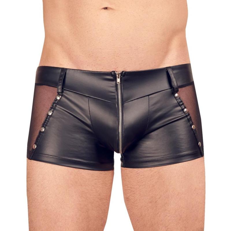 Pantaloni enfatizzanti di Svenjoyment in look opaco di tendenza, ognuno con inserto in rete trasparente e decorazione con rivetti sul lato. Con passanti per la cintura e cerniera sottostante sul davanti.